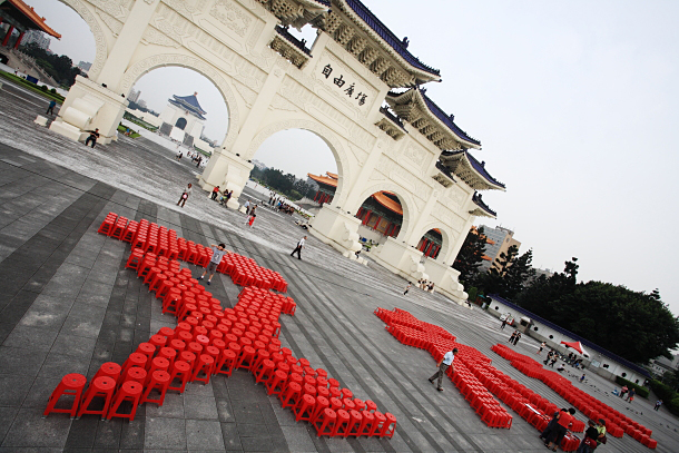 六四這天,貝嶺選擇從艾未未這項展覽的概念出發,在自由廣場下用1001張椅子排出「艾未未」三個字,並且在下午6點04分時擺下最後一道筆劃。「他原本是要搭機來台,討論策展的事情,卻在機場被逮捕了。所以我們用1001張空椅子,等待艾未未。」