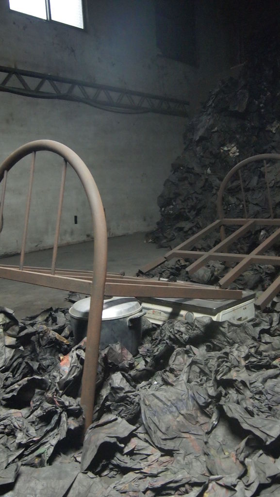 幸福大廈的展覽分成三個部分:家、派遣和遷移。拍攝現場那些被舊報紙塞滿的房間、堆滿行李箱的大廳、堆積如山的廢棄電子用品,也反映了拍攝對象面臨的生活狀態。最後即將被拆除的大廈,被迫遷移的人們將沈重的行李放上推車,漫無目的的離去,消失在大樓林立的都市裡。陳界仁說,藝術形式讓一個事件能夠被放大,撐起矛盾的張力,這些令人不舒服的場景,投射出現時生活的苦悶,「只有當我們去說我們有多苦悶時,才有可能開始討論。」